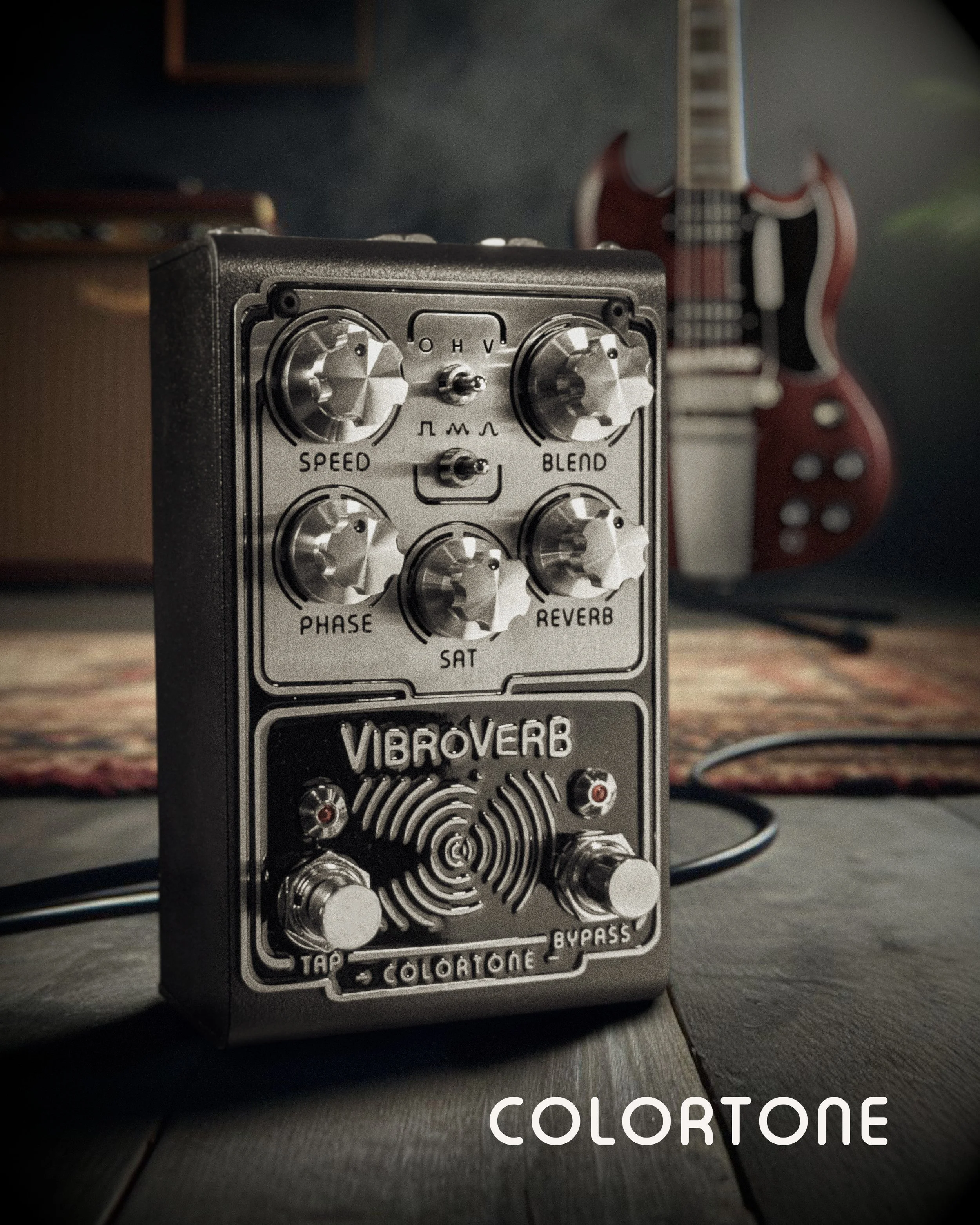The Colortone VibroVerb is a luscious multi mode stereo modulation pedal. Featuring Optical Tremolo, Harmonic Tremolo, and Vibe settings, with independant Reverb and Saturation controls, VibroVerb provides a kaleidoscope of sonic possibilities.
